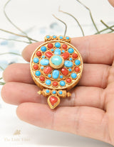 Searching for a real eye-catcher? Look no further than this Tibetan pendant with gold plated on silver with bright Turquoise detail. The pendant possesses an authentic ethnic touch through its design which further draws attention to this stunning piece.