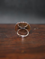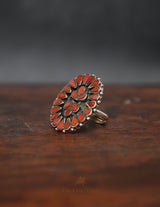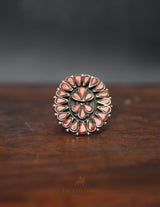 A radiant expression of Himalayan beauty and heritage, this Adjustable Tibetan Red Coral Ring is a striking handcrafted piece made from 925 sterling silver. At its centre blooms a circular floral design, inspired by traditional highland flower petals, and adorned with 25 genuine Tibetan red coral studs.