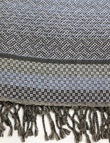 This indigo blue boiled wool blanket features a richly textured surface with intricate geometric patterns in slate blue, grey, and charcoal tones. Elegant yet understated, it brings depth, warmth, and a calm colour palette to any living space.