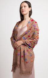 This fine embroidered shawl is woven with vibrantly coloured floral embroidery by Kashmir Valley artists. Its beautiful range of bright fluorescent blues and rich red, along with its classy, intricate chain stitching, make it eye-catching!