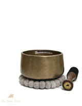 This very old antique Tibetan singing bowl is a parallel-walled design with a thick and tall structure, producing a strong, focused vibration tuned to the E Note. It resonates with the Third Eye Chakra, enhancing spiritual awareness, intuitive clarity, and inner perception. Weighing 1135g and measuring 18.5cm in diameter, it features a rare artisan’s signature, a mark of its origin and authenticity. Its substantial build and timeless aged patina reflect centuries of ritual use, while the hand-hammered finish and powerful resonance make it a valuable tool for deep healing work and an exceptional collector’s piece.