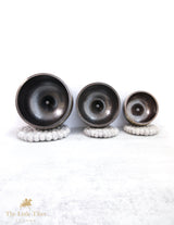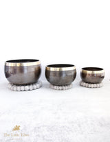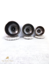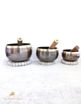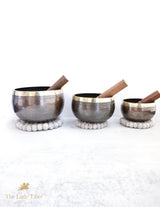 These singing bowls have beautiful gold colour rim with black base. They have lingum shape inside with the perfect round and hand hammered finishing, this shiny and unique looking bowl are suitable for beginners to explore their way into energy healing. The modest-sized bowl fits nicely in hand, and it emanates pure and slightly high sound compared to the big-sized brass bowls, which is versatile for personal use or in a group.