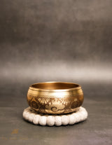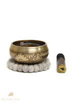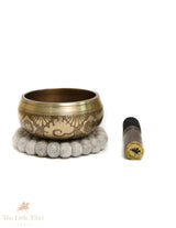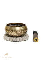 This Bronze Tibetan Singing Bowl features a serene image of the Buddha in meditation, seated at the centre and encircled by an elegant lotus flower motif, symbolising purity and enlightenment. On the underside, the Buddha’s Wisdom Eye is hand-etched—an ancient symbol of inner vision and universal awareness. The bowl is machine-formed for tonal consistency, while all surface etchings are hand-crafted, giving each piece its own character. Tuned to the E Note, it corresponds with the Third Eye Chakra, supporting insight, perception, and intuition. Weighing 517g and measuring 11cm in diameter, this bowl is easy to play and ideal for beginners, offering crisp, clean tones with excellent sustain.