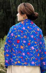Intricately woven in delicate threads of the finest silk, this blue shawl provides warmth and comfort in elegant style.