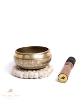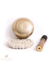 At the base of this bowl is the Om, The symbol of the sound of the universe. Then, on this bowl's walls, the Buddha's mantra of compassion, "Om Mani Pad Me Hum", is seen frequently. It is a universal mantra that has the essence of the entire Buddha's teaching. Playing with this bowl indirectly invokes this sacred mantra within the environment. In Tibet, nuns stamp this mantra on rivers, and monks carve them on the mountainside. Others devise them on prayer flags and let the wind drives the message into the universe.