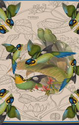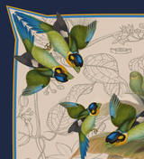 This extraordinary bird, Psarisomus dalhousiae, is instantly recognisable with its yellow throat, vivid blue-green plumage, and long elegant tail. Highly sociable and often travelling in lively flocks, the broadbill is a symbol of community, harmony, and vibrancy. The scarf captures these qualities in a colourful design, celebrating both the bird’s beauty and the natural forests it inhabits.
