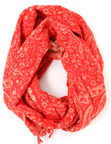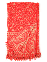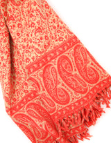 The only vibrant cosy scarf you will ever need. This wool shawl with red orange and cream colours decorated with a paisley design compliments each reverse side of this shawl. A stylish and comfortable shawl for all of your needs such as for yoga, an essential piece, on your travels, or a drape over the sofa or even your shoulder.