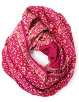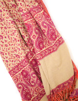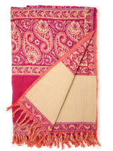 The only vibrant cosy scarf you will ever need. This wool shawl with dark pink and cream colours decorated with a paisley design compliments each reverse side of this shawl. A stylish and comfortable chunky knit for all of your needs such as for yoga, an essential piece, on your travels, or a drape over the sofa or even your shoulder.