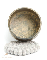 Discover the Antique Echo Singing Bowl, a captivating masterpiece that encapsulates the essence of timeless charm. Crafted with meticulous detail, this antique bowl features a unique combination of a wide flanged lip, gently mounded centre, and low profile, all contributing to its distinct and captivating resonance. Experience the gong-like reverberations that emanate from its responsive playability, creating a harmonious connection to the past. Unveil a melodic wonderland as you explore the harmonious union of E and F notes, each striking and gliding around the rim revealing an ethereal symphony that defies time. Its attractive bright golden bronze hue reflects its elegant heritage and exquisite craftsmanship. Complete with a padded striker and a double-ended teak and suede ringer, this Antique Echo Singing Bowl, extremely rare, invites you to rediscover the melodies of antiquity and embark on an enchanting auditory odyssey through the ages. Elevate your space, engage your senses, and let the resonant tale of the Antique Echo Singing Bowl captivate your soul. Experience the allure of rare musical treasures with this antique singing bowl - a true embodiment of elegance and melody.