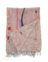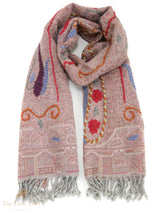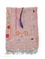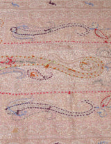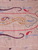 Embrace timeless elegance with the Rose Petal Hand-Embroidered Boiled Wool Scarf, a luxurious blend of heritage craftsmanship and sustainable fashion. This 100% pure wool scarf undergoes an ancient high-temperature boiling process, ensuring lasting softness, durability, and resistance to further shrinkage. The delicate hand embroidery, featuring intricate paisley and floral motifs in soft lilac, red, and warm golden tones, enhances the beauty of its romantic blush pink base.