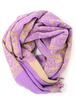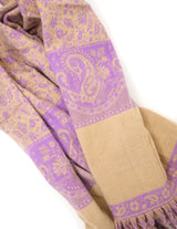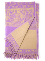 The only vibrant cosy scarf you will ever need. This wool shawl with lavender and cream colours decorated with a paisley design compliments each reverse side of this shawl. A stylish and comfortable chunky knit for all of your needs such as for yoga, an essential piece, on your travels, or a drape over the sofa or even your shoulder.