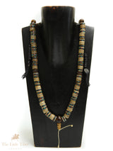 This antique Tibetan mala features 108 disc-shaped yak bone beads, each intricately carved with a central ridge inlaid with brass, red, and blue decorative fillings. The bone has aged naturally over time, displaying subtle signs of wear and patina that enhance its authentic vintage character. The disc shape and multi-tonal inlay make this mala both spiritually meaningful and visually captivating. Ideal for prayer, chanting, or wearing as spiritual jewellery, it can be used as a neck mala or wrapped around the wrist.
