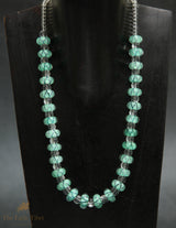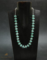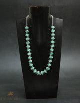 This handcrafted Murano glass necklace is adorned with a vibrant mix of turquoise beads and clear crystal spacers, creating a striking balance of traditional elegance and modern design. The composition features larger round Murano glass beads with smaller accent beads, offering a layered visual depth and comfortable wear.