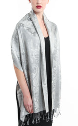 This bright silver silk scarf has intricate paisley patterns, perfectly woven in pure silk to radiate a luxurious allure. The scarf and silky touch's softness make it an ideal gift for someone you would like to treat.