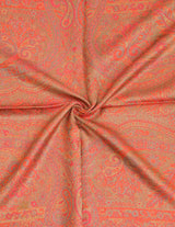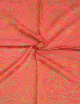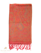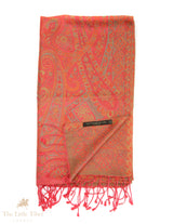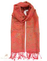Elevate your wardrobe with the Scarlet Glow Himalayan Silk Scarf, a stunning handwoven masterpiece crafted from 100% pure silk. This smaller-sized wrap (20" x 80") is designed for effortless styling, offering a refined yet vibrant touch to any outfit. The intricate Tibetan paisley and floral motifs, woven in rich scarlet red, warm gold, and soft orange hues, create an iridescent effect that shifts beautifully in the light.