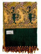 This Tibet shawl features a striking combination of deep forest green and warm mustard yellow, decorated with intricate paisley and floral motifs inspired by traditional Himalayan textiles. Rich in colour and texture, it brings warmth and character to any outfit.