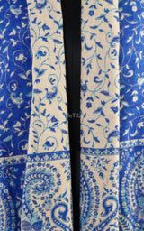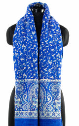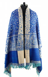 Look as stylish as a beautiful Lapis Lazuli stone in this shawl. This wool shawl is complimented with cream on the reverse and a paisley pattern throughout. This piece is stylish and versatile enough for your everyday uses such as for yoga, on your travels, or drape over the sofa or even your shoulder.
