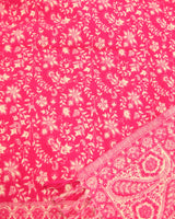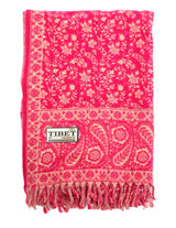 This Tibet shawl features a vibrant raspberry pink base softened with warm cream tones, woven with intricate floral and paisley motifs inspired by traditional Himalayan textiles. Bold yet elegant, it brings colour, warmth, and texture to any outfit.