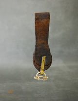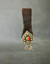 A fine 19th-century Tibetan belt hook with a leather base, silver overlay, and rich Tibetan coral stud. Traditionally worn to hold nomadic pouches and tools, this piece reflects both practical Tibetan mountain life and personal style.