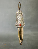The pouch features a richly hand-carved silver front layer and a leather back for durability. A striking dark red Tibetan coral stud adorns the front, adding a bold accent of colour and symbolising protection and vitality. The interior includes a clever wool-lined pocket, which can be opened by pulling from the bottom and secured by tightening leather straps from above — an ingenious traditional closure system.