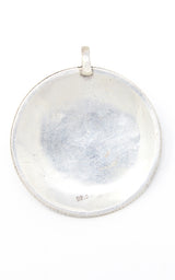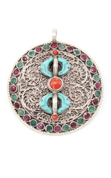 Wear something different and unique with this silver pendant. This timeless piece decorated around its edges with Ruby and Emerald gemstones; right in the centre is a Turquoise thunderbolt (Dorjee in Tibetan) and is intricately designed on sterling silver.