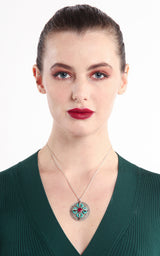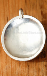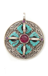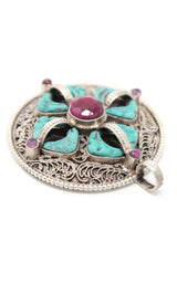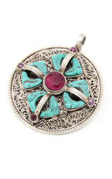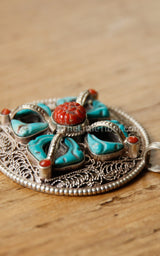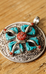 Wear this unique pendant with a silver base complete with the elegant detailing of Turquoise and Ruby colours. This pendant really does possess an authentic, ethical touch, and it is noted to be used during prayers which adds to its significance. The centre contains a Turquoise double thunderbolt (Dorjee in Tibetan) known to represent strength and firmness.
