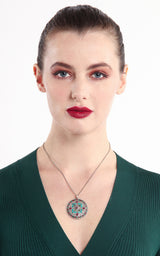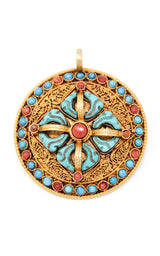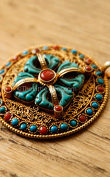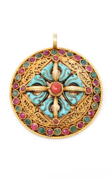 Wear this unique pendant with a gold base complete with the elegant detailing of Turquoise and red coral. This pendant really does possess an authentic, ethical touch, and it is noted to be used during prayers which adds to its significance. The centre contains a Turquoise double thunderbolt (Dorjee in Tibetan) known to represent strength and firmness.