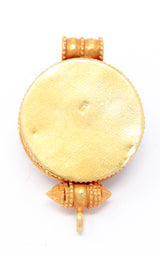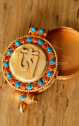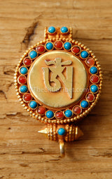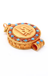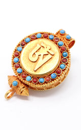 A true statement piece comes in the form of this hand crafted locket pendant with the Tibetan letter "Om" centred in the middle. Om meaning truth. It has been made of gold plated on top of a sterling silver base. Its aesthetic has been enhanced with semi-precious red coral and Tibetan turquoise at the edges. Also, it can be opened from the back with two thread holes which would come in handy when locking the locket pendant by its knot. Add some statement style and significance to your fashion through this locket by wearing it beautifully around your neck. Or simply, consider this locket pendant to be a great add-on to your personal collection.