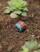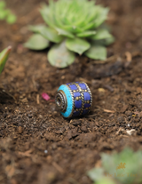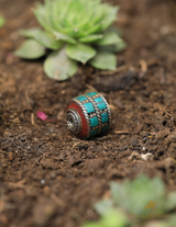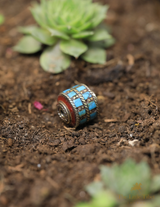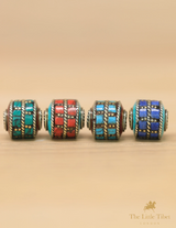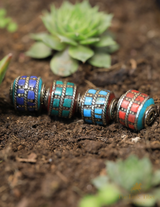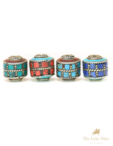 These barrel-shaped Tibetan beads feature an inlay of Turquoise composite, Coral Resin, and brass. The beautiful colours of these particular beads are Turquoise, Red Coral, Green, and Purple.