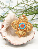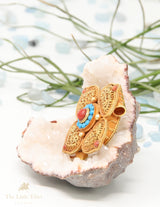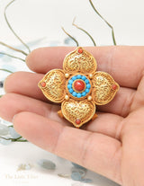 Searching for a real eye-catcher? Look no further than this Tibetan pendant with gold plated on silver with bright Turquoise detail. The pendant possesses an authentic ethnic touch through its design which further draws attention to this stunning piece.