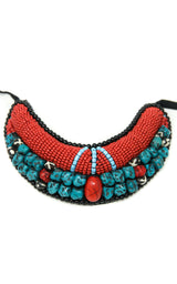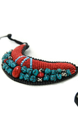 This unique Tibetan handmade and hand-beaded necklace is also known as the “Kyi Bhub”. It is a smaller version of our other Tibetan neckpiece but still stands out nonetheless. It has been designed with fine-grain clay and is beautifully decorated with eye-catching turquoise, coral, amber and rare precious stones to make it distinctive. There is a soft black fabric string to keep it held well around the neck. The uniqueness of this beaded necklace is something not to miss.