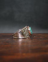 Stones: 1 central turquoise + 14 surrounding red coral studs