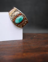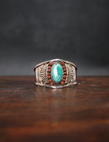A radiant fusion of Himalayan artistry and spiritual symbolism, this Tibetan Coral & Turquoise Halo Bangle showcases a well-cut central turquoise stone of rich colour, encircled by 14 fine red coral studs in a floral-inspired arrangement.