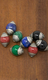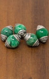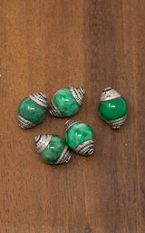 The inlay process is a skilled art, where portions of metal are carved out and filled with gemstone. Here, polished jade is set flush against the metal alloy, giving each bead a unique finish and antique look.