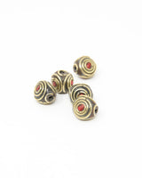 Each piece of these Tibetan beads has alternating inlays of bands of Red Coral and brass. The ones shown above are triangle-shaped and the base material is refined clay.