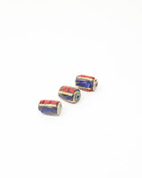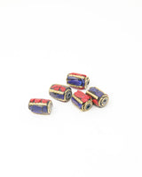 Each piece of these Tibetan beads has alternating inlays of bands of Red Coral, Lapis Lazuli, and brass. The ones shown above are tube in shape and the base material is refined clay.