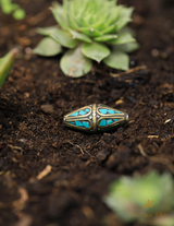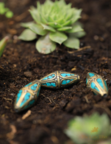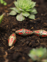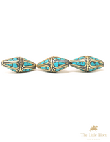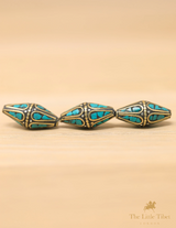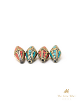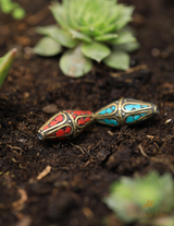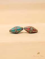 These bicone Tibetan beads feature an inlay of Turquoise composite, Coral Resin, and brass. The beautiful colours of these beads are Red and Green.