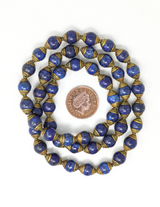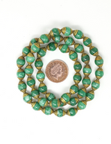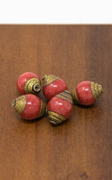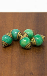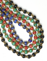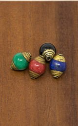 Each piece of these Tibetan beads has alternating inlays of bands of gemstones you can choose from Green Turquoise, Black Onyx, Blue Lapis Lazuli, Red Coral) and brass. The ones shown above are barrel-shaped.