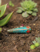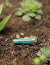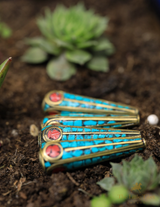 - Materials: Turquoise composite, Red Coral resin, brass, clay