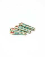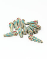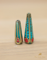 Each piece of these Tibetan beads has alternating inlays of bands of Turquoise composite and Red Coral resin, and brass. The ones shown above are teardrop in shape.