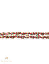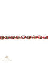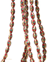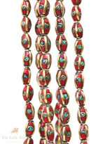 Each piece of these Tibetan beads has alternating inlays of bands of Red Coral, Turquoise composite, and brass. The ones shown above are barrel in shape and the base material is refined clay.
