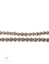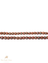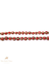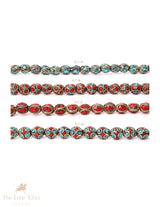 These Tibetan beads feature vibrant inlays of Red Coral, Turquoise composite, and brass, all set in a sleek barrel shape with a refined clay base. Each handmade bead is unique, offering subtle variations.