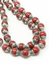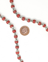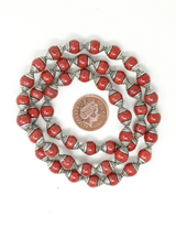 Handmade Tibetan inlay beads featuring alternating bands of Red Coral and white metal alloy. Their bold barrel shape makes them perfect for jewellery projects such as necklaces, bracelets, chokers, and prayer beads.