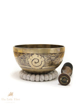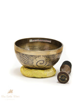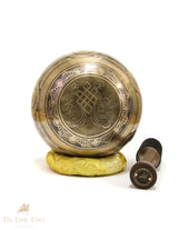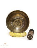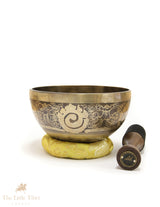 The centre of the bowl features the sacred Om mantra, symbolising universal energy and spiritual connection. The base is adorned with the Endless Knot, representing eternal harmony and interconnectedness. The outer walls showcase intricate designs of traditional Tibetan auspicious symbols, adding to its spiritual significance.