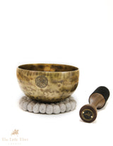 The bowl features beautifully carved Om symbols and traditional good luck signs, symbolising universal energy and positive fortune. Its rich, resonant tone makes it ideal for sound healing, chakra alignment, and mindfulness.