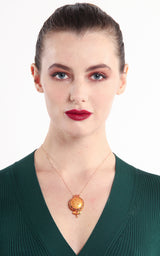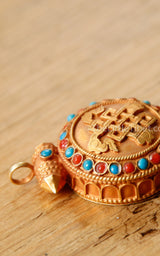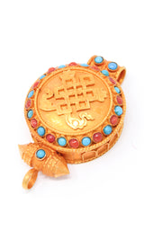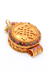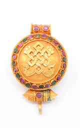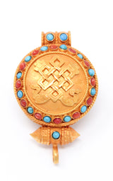 A statement locket pendant embellished with the Tibetan endless knot. This locket has been beautifully hand-crafted to radiate its traditional design which ultimately helps it to retain its individuality among other jewellery. The locket pendant is gold plated on sterling silver, decorated with a variety of precious Turquoise coloured stones. The endless knot is one of the eight auspicious symbols in Tibetan Buddhism, it stands for karmic consequences and it is symbolic of the cyclic nature (the endless cycle of birth, death and rebirth). The symbol has no beginning or end which affirms the wisdom of Buddha.
