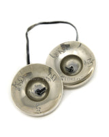 Shape: Symmetrical Arrangement of two domed shape metal and a leather string looped between their central holders.
